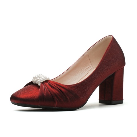 Cổ điển của phụ nữ satin Bridal Giày xu hướng thời trang mới 5cm-7cm vuông gót bơm ngón chân nhọn ăn mặc Slip-on đế